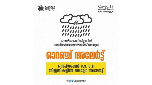 എന്നീ ജില്ലകളിൽ കേന്ദ്ര കാലാവസ്ഥ വകുപ്പ് ഒറ്റപ്പെട്ടയിടങ്ങളിൽ അതിശക്തമായ മഴക്കുള്ള സാധ്യത പ്രവചിച്ചിരിക്കുന്നു. 24 മണിക്കൂറിൽ 115.6 mm മുതൽ 204.4 mm വരെ മഴ ലഭിക്കുമെന്നാണ് അതിശക്തമായ മഴ (Very Heavy) എന്നത് കൊണ്ട് കാലാവസ്ഥ വകുപ്പ് അർത്ഥമാക്കുന്നത്. കാലാവസ്ഥ വകുപ്പ് ഈ ജില്ലകൾക്ക് ഓറഞ്ച് അലേർട്ട് ആണ് പ്രഖ്യാപിച്ചിട്ടുള്ളത്