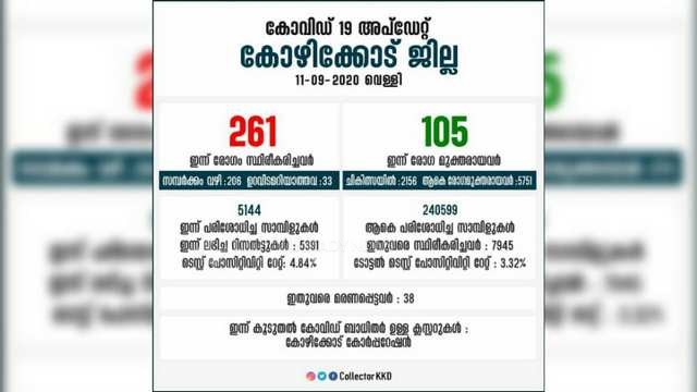 കോഴിക്കോട് ജില്ലയില് ഇന്ന് (സെപ്തംബര് 11) 261 പോസിറ്റീവ് കേസുകള് കൂടി റിപ്പോര്ട്ട് ചെയ്തതിട്ടുണ്ട്.