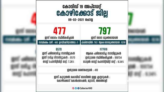 കോഴിക്കോട് ജില്ലയിൽ 477പേര്‍ക്ക് കൊവിഡ്,സമ്പര്‍ക്കം വഴി 464 പേര്‍ക്ക് രോഗം