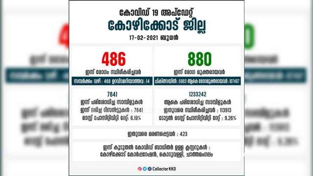 കോഴിക്കോട് ജില്ലയില് ഇന്ന് 486 പേര്ക്ക് കോവിഡ്;രോഗമുക്തി 880