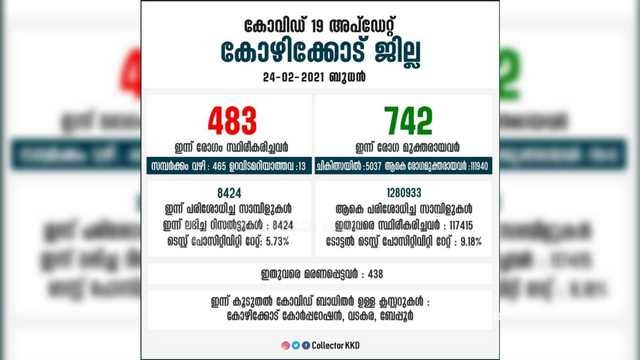 കോഴിക്കോട് ജില്ലയില് ഇന്ന് 483 പേർക്ക് കോവിഡ്, 742 പേര് രോഗമുക്തിനേടി