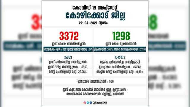 കോഴിക്കോട്: ജില്ലയില് ഇന്ന് 3372 പോസിറ്റീവ് കേസുകള്