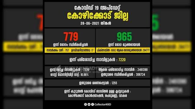 കോഴിക്കോട് ജില്ലയില് ഇന്ന് 779 പേര്ക്ക് കോവിഡ് രോഗമുക്തി 965, _ടി.പി.ആര് 10.98 %_