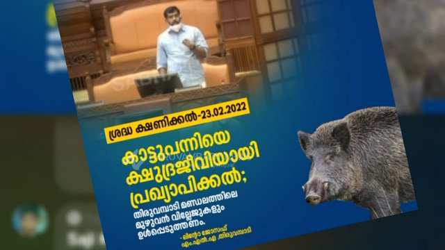 തിരുവമ്പാടി: സംസ്ഥാനത്ത് ഏറ്റവും കൂടുതൽ വന്യമൃഗ ആക്രമണം നടക്കുന്ന പ്രദേശങ്ങളിലൊന്നാണ് തിരുവമ്പാടി നിയോജകമണ്ഡലം. കാട്ടുപന്നികൾ പൊതുജനങ്ങൾക്ക് ജീവഹാനി ഉണ്ടാക്കുന്ന വിധം പോലും വിഹരിക്കുകയാണ് എന്നും, ഇത് നിരന്തരമായി സർക്കാരിന്റെ ശ്രദ്ധയിൽ പെടുത്തിയിട്ടുള്ള വിഷയമാണെന്നും. കാട്ടുപന്നിയെ ക്ഷുദ്രജീവിയായി പ്രഖ്യാപിക്കാൻ കേന്ദ്രസർക്കാരിനോട് സംസ്ഥാനം ആവശ്യപ്പെട്ടിട്ടുള്ളതാണെന്നും തിരുവമ്പാടി എം.എൽ.എ ലിൻ്റോ ജോസഫ് പറഞ്ഞു.