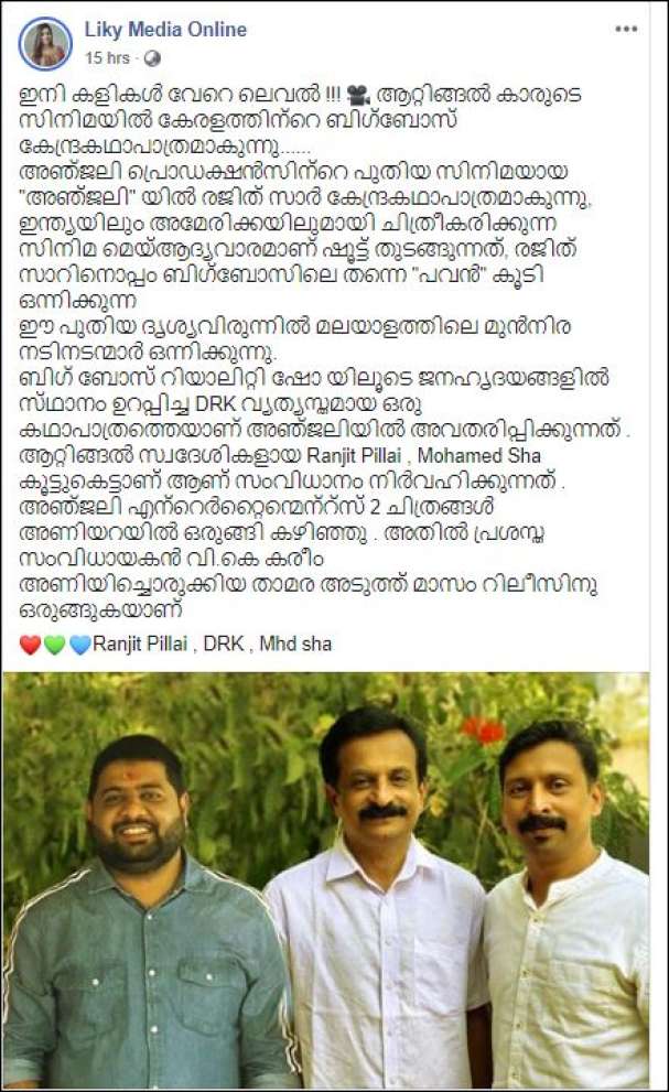 ബിഗ് ബോസ് എന്ന റിയാലിറ്റി ഷോയിലൂടെ പ്രേക്ഷകരുടെ ഇഷ്ടതാരമായി മാറിയ ഡോ.രജിത് കുമാര് സിനിമയിലേക്ക്. ചിത്രത്തില് നായകനായാണ് താരത്തിന്റെ അരങ്ങേറ്റം. ‘അഞ്ജലി’ എന്നാണ് ചിത്രത്തിന് നല്കിയിരിക്കുന്ന പേര്. ഇന്ത്യയിലും അമേരിക്കയിലുമായാണ് ചിത്രം ചിത്രീകരിക്കുന്നത്. മെയ് മാസം ചിത്രത്തിന്റെ ചിത്രീകരണം ആരംഭിക്കും.
